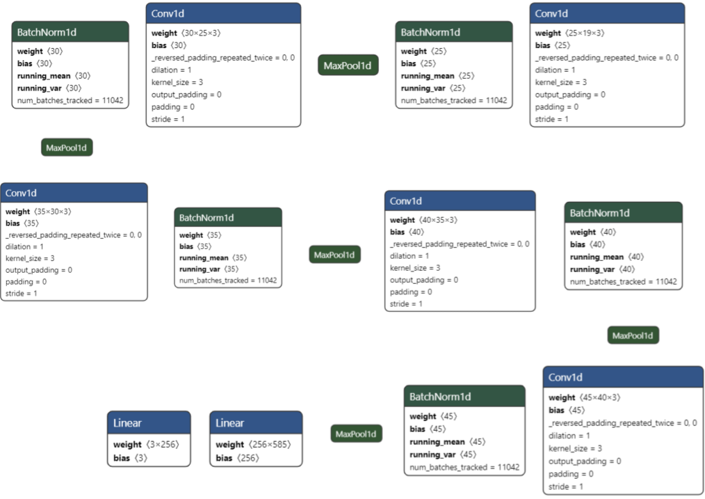 19 → 25 → 30 → 35 → 40 → 50 channels across 5 Conv1D layers, each followed by BatchNorm1d and MaxPool1d (kernel=4, stride=4).