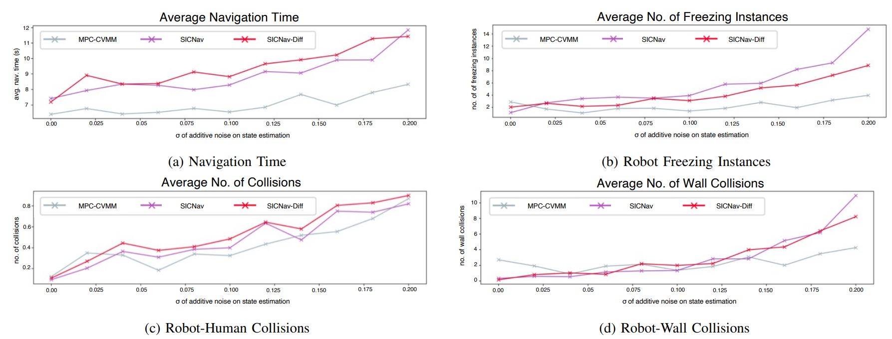 A simulation study evaluated robustness to localization and perception noise. SICNav was compared against SICNav-Diffusion (data-driven human intention prediction) and a non-interactive MPC baseline using Constant Velocity Motion Model (CVMM). Results showed that noise levels beyond σ=0.03 begin to narrow the performance gap between methods, motivating further study with per-component noise analysis in future work.