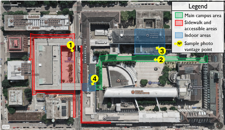 The robot was deployed at the Technical University of Munich campus in Maxvorstadt, Germany, across three distinct environments: